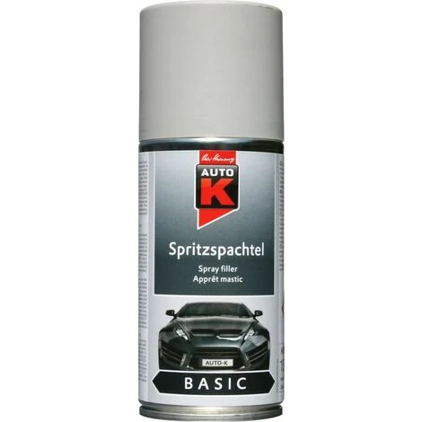 Auto-K Spritzspachtel ist ideal zum Füllen oder Ausgleichen von Unebenheiten oder zur Beseitigung von Kratzern und Schrammen ohne großen Zeitaufwand. Das Produkt schützt vor Korrosion, haftet gut und schafft einen glatten Untergrund. Dadurch wird eine gleichmäßige Decklackierung gewährleistet. Hinweis: Nicht auf kunstharzlackierte Oberflächen sprühen, da der Lack eventuell hochziehen kann.Ausgleichen und Schließen von Unebenheiten, Kratzern und Schrammen am Autosorgt für die porenfreie Oberflächeguter Verlaufhoher FestkörpergehaltInhalt: 150 mlFarbe: grausehr ergiebigrasche Antrocknung, gute DurchtrocknungBindemittelbasis: NitokombinationsharzSprühauftrag: bei 2 Kreuzgängen: 70-80 µm, Schichtdicke >90 µmTrockenzeiten: staubtrocken nach 5-10 Min., grifffest nach 30-40 Min., durchgetrocknet nach ca. 24 StundenÜberlackierbar: mit sich selbst und mit allen Auto-K-Lacken zu jedem ZeitpunktLackieraufbau: 1. Auto-K Korrosionsschutz-Grundierung, 2. Auto-K Spritzspachtel, 3. Decklack