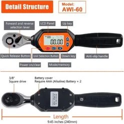 Gro?es LCD-Display, das Messungen in N-m, kgf-cm liefert , lbf-ft, lbf-in. 2 Messmodi: Echtzeitmodus und Spitzenmodus mit 9 S?tzen voreingestellter Speicherkapazit?t.