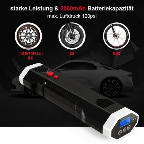 - 【Leistungsstark】Der Kompressor besitzt einen leistungsstarken Elektromotor, der einen maximalen Fülldruck von bis zu 8,3 Bargewährt, für ein schnelles und effizientes Aufpumpen. Dank seines integrierten 2000 mAh starken Akkus kann er hierbei bis zu 4 Räder am Stück füllen.