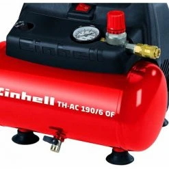 Mit dem äußerst mobilen und kompakten Kompressor TH-AC 190/6 OF lassen sich viele einfache Druckluftarbeiten in Haushalt, Garten und Garage oder beim Camping schnell selbst erledigen. Dank Druckluftspeicher und einem Kesselvolumen von 6 Litern lassen sich kleine Arbeiten durchführen, ohne dass der Motor erneut anläuft. Da der Luftverdichter ohne Schmierung auskommt, ist das Gerät ölfrei und wartungsarm. So lässt sich das Gerät bequem in jeder Position transportieren. Der TH-AC 190/6 OF Kompressor lässt sichmittels Druckregler von 0 bis 8 bar variabel auf viele Anwendungen einstellen. Der geregelte Arbeitsdruck wird dabei am Druckminderer reguliert, per Manometer angezeigt und an der Schnellkupplung abgenommen. Dank Sicherheitsventil ist für die Sicherheit des Bedieners bestens gesorgt. Die ergonomische Bauweise ermöglicht eine optimale Handhabung und den einfachen Transport. Der Standfuß ist mit einer Saugnapffunktion für sicheres Arbeiten ausgestattet und die praktische Kabelaufwicklung sorgt nach getaner Arbeitschnell für Ordnung.