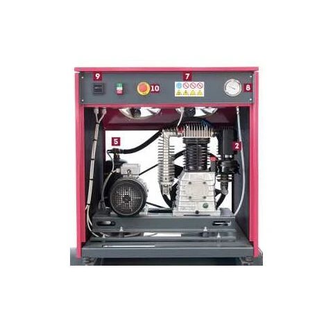 Ausführungsmerkmale Profi-Line SILENT:-Die hochwirksame Schalldämmung der ELMAG® Profi-Line SILENT Druckluftkompressoren reduziert den Schalldruck je nach Gerät auf 65 bis maximal 69 dB(A). Dies entspricht Gesprächslautstärke.Profi-Line SILENT Modelle sind daher gut für geräuschsensible Produktionsbereiche, auch für Büroumgebung, geeignet und überzeugen durch den hohen Entwicklungsstand der bewährten EUROCOOL-Geräte:- Keilriemenantrieb: großzügige Übersetzung, optimierter Wirkungsgrad- Niedrige Aggregatdrehzahl: 1.000 bis max. 1.450 Upm- Geräuscharmer Betrieb: 65 – 69 dB(A)- Niedrige Drucklufttemperatur- Geringe Kondensatentwicklung und sehr gute DruckluftqualitätAlle Profi-Line SILENT Kompressoren sind mit einem zentralen Bedienpult ausgestattet – ab Modell PLS 500/10 D ist ein optionaler Fremdkessel erforderlich.- Betriebsdruck bis 10 bar- Antrieb 400 Volt, 50 Hertz- Motorschutzrelais- Magnetventil für Anlaufentlastung, inklusive Schütz- Indirekter, optimierter Antrieb- Robuster Kompressorzylinder aus Grauguss mit großflächigen Kühlrippen- Hochleistungs-Präzisionskolben- Zweistufig verdichtend- Zwischen- und Nachkühler aus Alu-Druckguss mit großflächigen, tiefen Kühlrippen- Großzügiges, strömungsoptimiertes Guss-Lüfterrad für eine wirksame Kühlung des Aggregats1 3 l Druckausgleichsbehälter, vorbereitet für Anschluss an externen DL-Behälter 2 Luftansaugfilter mit Schalldämmung 3 Sicherheits- & Rückschlagventil 4 Externe Kondensatableitung mittel Kugelhahn 5 Anlaufentlastung mit Elektro-Magnetventil 6 Thermisch gesteuerte Kühlventilatoren 7 Motorschutzrelais 8 Manometer für Behälterdruck 9 Betriebsstundenzähler10 Not-Aus-Schalter3 l Druckausgleichsbehälter, vorbereitet für Anschluss an externen DL-BehälterLuftansaugfilter mit SchalldämmungSicherheits- & RückschlagventilExterne Kondensatableitung mittels KugelhahnAnlaufentlastung mit Elektro-MagnetventilThermisch gesteuerte KühlventilatorenMotorschutzrelaisManometer für BehälterdruckBetriebsstundenzählerNot-Aus-Schalter | Eigenschaften: Länge: 90, Breite: 68, Gewicht: 168, Höhe: 100