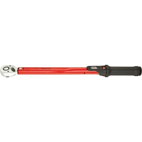 Drehmomentschl�ssel Ausf�hrung: H�chste Pr�zision auch bei starkem Dauergebrauch. Verstellbarer Drehmomentschl�ssel mit Vierkantantrieb und integrierter Hebel-Umschaltknarren-Funktion f�r den kontrollierten Rechts- und Linksanzug. Robuste Stahlrohr-Konstruktion, mit verzinkter Knarre. Die Knickmechanik mit Gleitrolle garantiert ein akustisches und f�hlbares Ausl�sesignal. Leichte und komfortable Skaleneinstellung durch Verdrehen des Griffes und Arretierung �ber Einschubknopf, extrem hohe Genauigkeit durch Mikrometerskalenring. Lieferung in Kunststoffbox inkl. Pr�fzertifikat nach DIN EN ISO 6789. Anwendung: F�r den kontrollierten Schraubenanzug im entsprechenden Drehmomentbereich, f�r s�mtliche industrielle Fertigungsbereiche.