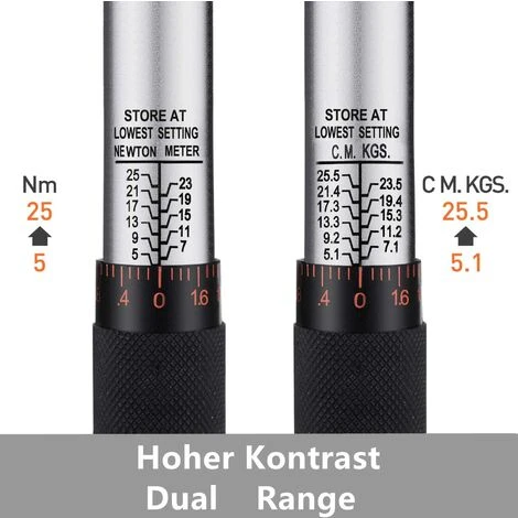 Ganzer StahlbauAlle Stahlkonstruktionen bieten gleichbleibende Leistung und jahrelangen zuverlässigen Service. Rändelgriff verhindert ein Verrutschen der Hand und hält den Griff fest. Sliver Chrom-Beschichtung mit Sandstrahlen für Körper, schwarz verchromt für Hülse, ist es langlebig und Rostschutz. | Leicht zu bedienenReversible Ratschenkopf fährt in beiden Richtungen zum Anziehen und Lösen, es ist einfach, Ihr Drehmoment einzustellen und zu verriegeln, indem Sie Hülse und Mutter antreiben. „Click“ ertönt, wenn der Schlüssel das voreingestellte Drehmoment erreicht, um eine Überlastung zu vermeiden. | Hohe QualitätEs hat hohe Kontrast für einfaches Ablesen auch in niedrigen Situationen. Extern mit Zerstäubung behandelt, kann es Ihre Augen vor Blendung in einem starken Licht schützen. |