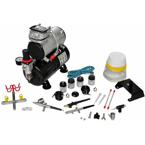 Dieses Kompressorset ist für die Verwendung mit Airbrush und kleinen Spritzpistolen konzipiert. Dieses hochwertige Airbrush-Set ist ideal geeignet für alle Arten von Modelbau, Spray Tanning, Modellieren, Kosmetik, Tattoos, T-Shirts, Fingernägel, Fahrradhelm und viel mehr!Das Set besteht aus einem Airbrush Kompressor, 3 Airbrush-Pistolen und weiteren umfanreichem Zubehör: 1 x Mini KolbenkompressorHohwertiger ölfreier Kolbenkompressor mit 3 Liter Luftbehältet, Monometer, Druckluftregler, Luftfilter. Der Kompressor ist verwendbar für alle Airbrushpistolen mit 0,2~1,00 mm Düsen.Funktionen und MerkmalePortable & leicht3 Liter Luftbehälter: sorgt für einen reibungslosen Luftstrom, NullimpulsLuftdruckmesser und Luftfilter Verstellbare DruckluftÖlfrei und nicht luftverschmutztBeginnt mit LuftDurchgehende kraftvolle ArbeitAbschaltautomatik Innen thermisch geschütztGeräuscharm: 47dBSicherheitsschutzeinrichtungen für Luftbehälter2. Airbrush Spritzpistole mit Single Funktion-7 tlg. SetAirbrush Spritzpistole mit 0,8mm Düse für verschiedene Airbrushenmöglichkeiten. Geeignet für alle Arten von Modelbau, Kosmetik, Tattos, Lackierungen, Illustration und viel mehr! Ideal für grobes Arbeiten: z.B Grundierungen, Hintergründe usw..3. Airbrush Spritzpistole mit Double Funktion-8 tlg. SetDiese Airbrush Spritzpistole mit Doppelfunktion (8-teilig) kann für alle Arten von Modellbau, Kosmetik, Tattos, Malerei, Illustration und vieles mehr verwendet werden.4. Airbrush Spritzpistole mit Double Funktion-9 tlg. SetDas gesamte Set beinhaltet eine feine Kopf-Airbrush, 5 Fuß. Vinyl-Schlauch, 2 Unzen Jar, mit Deckel, angebracht 3/4 Unzen, ein Schraubenschlüssel, ein Antriebsregler und ein Adapter (1/4 ”-Luftschlauch vom Kompressor zum kleineren Luftbürste Schlauch)5. 3 in1 Airbrush-Reinigungs-Topf Mit diesem Airbrush 3-in-1-Reinigungs-Topf können Sie Ihre Airbrush ohne Übersprühen reinigen. 6. Airbrush-HalterungDiese Airbrush-Halterung kann fast alle Arten von Airbrush-Pistolen aufnehmen, die bis zu 4 Airbrush-Pistolen aufnehmen kömmen7. Mini Filter Anschlissen direkt an die Airbrush-Pistole. Mini-Filter ist die letzte Scritt für die Lieferung sauberer, trockener Luft für perfekte Leistung in Ihrem Airbrush-Arbeiten.8. 3-fach Schlauchverbindungsstück inkl. 2 StopperDer Verbinder kann direkt mit dem Kompressor oder zwischen dem Kompressor und den Pistolen verbunden werden, wodurch bis zu 3 Verbindungen gleichzeitig möglich sind.9. Schnellkupplung Dieser Verbinder wird in das Ende Ihres Luftschlauchs eingeschraubt. Durch einfaches Zurückschieben der Federhülse wird die Airbrush-Verbindung getrennt. Dieser Artikel ist selbstdichtend, wenn er nicht verbunden ist, sodass der Luftdruck vor dem Wechseln der Druckluftwerkzeuge nicht aus dem Schlauch genommen werden muss.Komplettes Lieferumfang: 1x Mini Kolbenkompressor mit 3 Liter Luftbehälter, Druckluftregler, Luftfilter, Monometer, Originalverpackung, 1x Airbrush Spritzpistole mit Single Funktion- 7 tlg.-Set in Aufbewahrbox, 1x Airbrush Spritzpistole mit Double Funktion- 8 tlg.-Set in Aufbewahrbox, 1x Airbrush Spritzpistole mit Double Funktion- 9 tlg.-Set in Aufbewahrbox1x 3 in1 Airbrush-Reinigungs-Topf, 1x Airbrush Halterung, 1x Mini Filter, 1x 3-fach Schlauchverbindungsstück inkl. 2 Stopper, 1x Schnellkupplung, 1x Adapter (M5 * 0.5-G1 / 8) und 1x Verbinder (G1 / 8female-G1 / 4male).