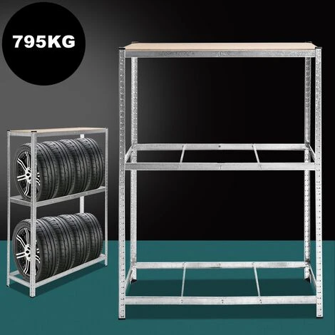 Das extra stabile Lager- und Werkstattregal für Auto Reifen wird aus verzinktem Stahl geformt und lässt sich überaus schnell und einfach aufbauen. Die Einzelnen Streben lassen sich werkzeuglos ineinanderstecken und bieten Platz für bis zu 8 KFZ Reifen. Zusätzlich verfügt der Reifenständer über einen extra Regalboden aus MDF Holz zur Ablage von z.B. Radkappen oder Felgen. Die speziell abgewinkelten Metallprofile gewährleisten eine optimale Lagerung der Reifen, haben keine scharfen Kanten und erzeugen keinerlei Druckstellen. Die zwei Reifenebenen und der obere Regalboden sind mit einer Zusatzstrebe verstärkt und bietet somit auch für größere bzw. schwerere Reifen, ausreichend Platz und Stabilität (mit max. 795 kg belastbar).