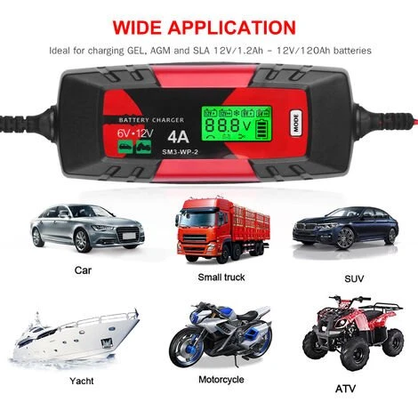 Wide Range Anwendung — Es arbeitet mit 12 V / 1,2 Ah bis 12 V / 120 Ah Blei-Säure-Batterien, AGM, Gel, SLA Batterien, was bedeutete, dass es für die Batterien in Auto, LKW verwendet werden kann, Motorrad, Rasenmäher, Boot, RV, SUV, ATV und vieles mehr.