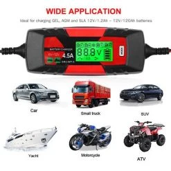 Wide Range Anwendung — Es arbeitet mit 12 V / 1,2 Ah bis 12 V / 120 Ah Blei-Säure-Batterien, AGM, Gel, SLA Batterien, was bedeutete, dass es für die Batterien in Auto, LKW verwendet werden kann, Motorrad, Rasenmäher, Boot, RV, SUV, ATV und vieles mehr.