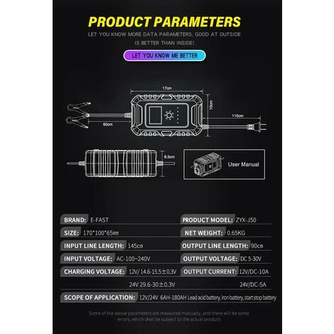 Das 7-stufige Batterieladegerät ist für die meisten Batterietypen von Bleibatterien geeignet, einschließlich Calcium, Gel, A GM, LiFePo4, Nass, Bleisäure usw. Eingebauter Mehrfachschutz und hilft, entleerte und sulfatierte Batterien wiederherzustellen verlängert die Lebensdauer der Batterien.