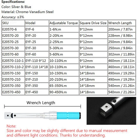 | E20570-350 | EYF-350 | 65-350 Nm | 14*18mm | 540 mm / 21.26 Zoll | 58 * 8,5 * 8 cm / 22,83 * 3,35 * 3,15 Zoll | 1900g / 4.19lbs |
