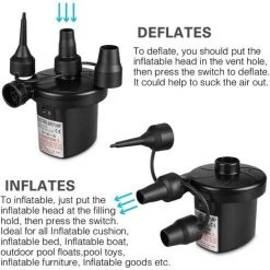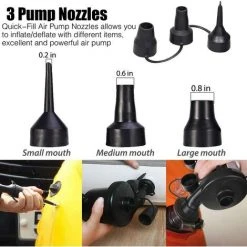 - 3 verschiedene Düsengrößen: Die Inflatorpumpe wird mit Düsen geliefert, die mehrere aufblasbare Gegenstände aufblasen und entleeren können. Sie sind für die meisten aufblasbaren Gegenstände geeignet, die Sie zum Aufblasen oder Entleeren benötigen. Sie funktionieren gut mit aufblasbaren Matratzen, Schwimmbädern, Bällen, Sofas, Wannen, aufblasbaren Pumpen, Wasserbetten, Booten, Poolspielzeug, Schwimmringen usw.