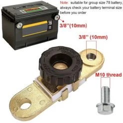 Merkmale: Material: Zinklegierung und Messing Spannung: 6 V, 12 V, 24 V Kabelgröße: 4-6 AWG Durchgangsklasse Strom: 200 A Kurbelrate: 500 A Batteriekopfdurchmesser: 10 mm Abmessungen: 10,1 x 3,6 x 3,3 cm Produktgewicht: 170 g