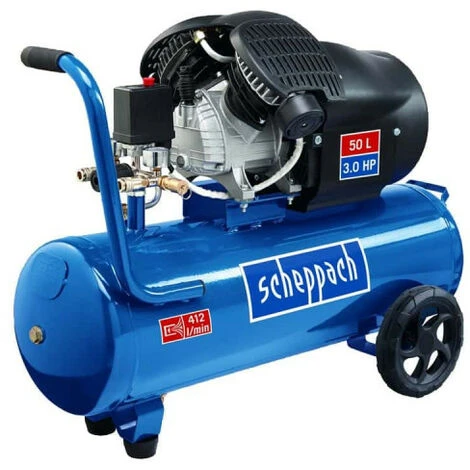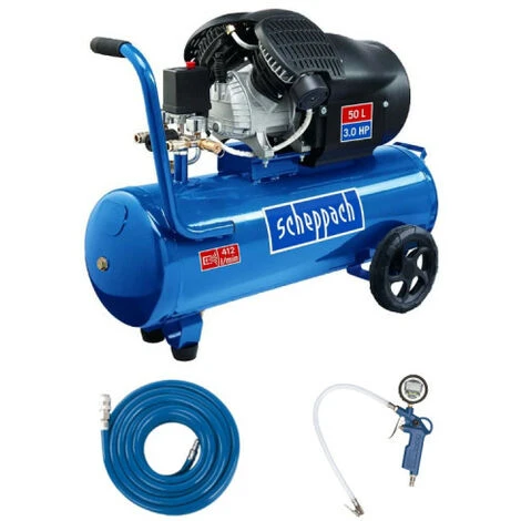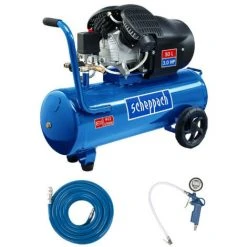 : Kompressor 50L 2200W – HC53DC : Tank mit 50 L Fassungsvermögen. Max. Druck bei der Arbeit: 10 bar Luftansaugkapazität: 412 L/min. Leistungsstarker Motor mit 3,0 PS Die zwei Zylinder sorgen für eine hohe Luftansaugkapazität. Manometer ermöglichen eine optimale Einstellung des Arbeitsdrucks. Schneller Werkzeugwechsel durch 2 Schnellkupplungen. Dank des Griffs und der Räder lässt sich das Gerät leicht bewegen. Verstärkter Gummischlauch 15 m : Einfach zu installieren Auf Widerstandsfähigkeit ausgelegt Hält hohem Druck stand SCHEPPACH Reifenfüllgriff – Digitalanzeige – 7906100736 : Gummiertes Manometer mit digitaler Anzeige. Möglichkeit, die Maeinheiten zu ändern: bar, MPa, kg/cm2, PSI. Leicht ablesbar dank digitaler Anzeige. Einfach zu bedienen Hoher Komfort bei der Handhabung Eigenschaften : Kompressor 50L 2200W – HC53DC : Leistung: 2200 W Abmessungen: 910 x 415 x 680 mm. Motor: 230-240 V Fassungsvermögen des Behälters: 50 L Max. Druck: 10 bar Lufteinlass: 412 L/min. Geräuschpegel: 97 dB(A) Gewicht brutto: 45,8 kg. Ref. 5906102901 Verstärkter Gummischlauch 15m : Länge: 15 m Innendurchmesser: 8 mm Wird mit Mundstück und Schnellkupplung geliefert. Max. Betriebsdruck: 20 Bar / 290 PSI