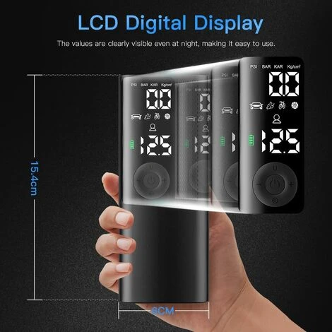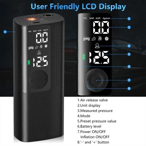 Digitales LCD-Display und LED-Anzeigen: Große Doppelanzeige, Echtzeit-Reifendruck und voreingestellte Reifendruckdaten auf einen Blick. In der Zwischenzeit ermöglichen Ihnen die eingebauten LED-Leuchten mit hoher Helligkeit das Aufblasen und Aufblasen Reifenwechsel nachts und bei anderen widrigen Bedingungen.