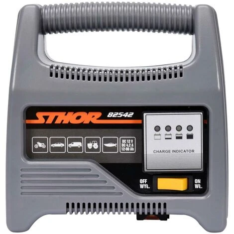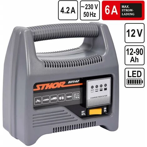 Das Ladegerät der Marke Sthor verfügt über einen Ringkerntrafo, Sicherungsschutz gegen Überladung und Überspannung, Stromschalter, sowie eine LED-Ladezustandsanzeige.
