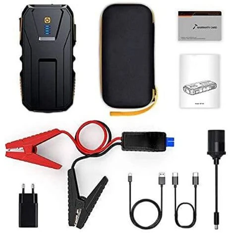 Lieferumfang: 1 x Auto-Starthilfe, 1 x intelligentes Überbrückungskabel, 1 x Wandladegerät, 1 x USB-Kabel, 1 x Zigarettenanzünder-Adapter, 1 x Typ-C-Kabel, 1 x EVA-Tragetasche.
