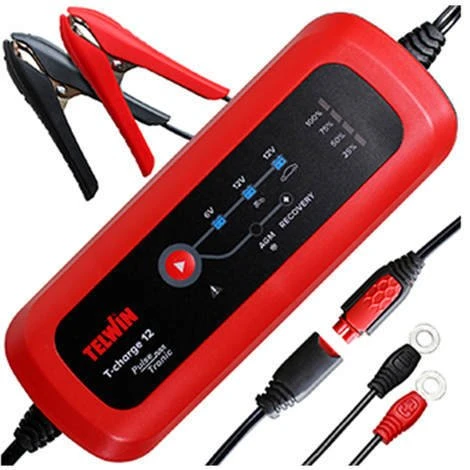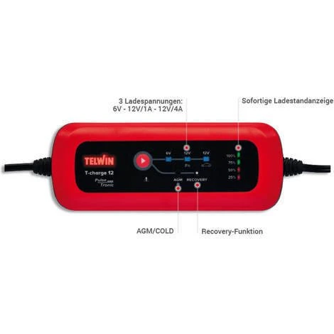 Die „T-Charge“ Serie von Telwin besteht aus kompakten, einfach anzuwendenden und multifunktionellen Batterieladegeräten und Erhaltungsladegeräten. Einsetzbar mit 6V oder 12V Batterien. Die elektronische Steuerung der Ladeprozesse ermöglicht dabei eine Vielzahl an nützlichen Funktionen. So unterstützt das T-Charge 12 das automatische Aufladen und Erhaltungsladen mit PulseTronic bei allen Batterietypen, einschließlich EFB. Darüber hinaus wird durch die COLD-Funktion das behutsame Laden selbst bei niedrigsten Temperaturen gewährleistet. Und mit der RECOVERY-Funktion wird ein Impulsverfahren angewendet, durch welches sich die Sulfate von den Bleiplatten lösen. Die ursprüngliche Batteriekapazität wird somit wiederhergestellt. Die Kombination dieser Technologien verlängert die Lebensdauer der Batterie erheblich.