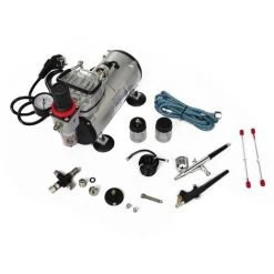 Dieses Kompressorset ist für die Verwendung mit Airbrush und kleinen Spritzpistolen konzipiert. Dieses hochwertige Airbrush-Set ist ideal geeignet für alle Arten von Modelbau, Spray Tanning, Modellieren, Kosmetik, Tattoos, T-Shirts, Fingernägel, Fahrradhelm und viel mehr!Das Set besteht aus einem Airbrush Kompressor, 2 Airbrush-Pistolen und weiteren umfanreichem Zubehör:1 x Mini Kolbenkompressor Hohwertiger ölfreier Kolbenkompressor mit Monometer, Druckluftregler, Luftfilter. Der Kompressor ist verwendbar für alle Airbrushpistolen mit 0,2~1,00 mm Düsen.Funktionen und MerkmalePortable & leichtThermisch geschutzGeräuscharm Verstellbare DruckluftÖlfrei Abschaltautomatik* Luftdruckmesser, Luftregler und LuftfilterBeginnt mit DruckDurchgehende kraftvolle Arbeit2. Airbrush Spritzpistole mit Single Funktion-7 tlg. SetAirbrush Spritzpistole mit 0,8mm Düse für verschiedene Airbrushenmöglichkeiten. Geeignet für alle Arten von Modelbau, Kosmetik, Tattos, Lackierungen, Illustration und viel mehr! Ideal für grobes Arbeiten: z.B Grundierungen, Hintergründe usw..3. Airbrush Spritzpistole mit Double Funktion-9 tlg. SetDas gesamte Set beinhaltet eine feine Kopf-Airbrush, 5 Fuß. Vinyl-Schlauch, 2 Unzen Jar, mit Deckel, angebracht 3/4 Unzen, ein Schraubenschlüssel, ein Antriebsregler und ein Adapter (1/4 ”-Luftschlauch vom Kompressor zum kleineren Luftbürste Schlauch)4. 3-fach Schlauchverbindungsstück inkl. 2 StopperDer Verbinder kann direkt mit dem Kompressor oder zwischen dem Kompressor und den Pistolen verbunden werden, wodurch bis zu 3 Verbindungen gleichzeitig möglich sind.Komplettes Lieferumfang: 1x Mini Kolbenkompressor mit Druckluftregler, Luftfilter, Monometer, Originalverpackung, 1x Airbrush Spritzpistole mit Single Funktion- 7 tlg.-Set in Aufbewahrbox, 1x Airbrush Spritzpistole mit Double Funktion- 9 tlg.-Set in Aufbewahrbox, 1x 3-fach Schlauchverbindungsstück inkl. 2 Stopper, Bedienungsanleitung in Englisch und Deutsch